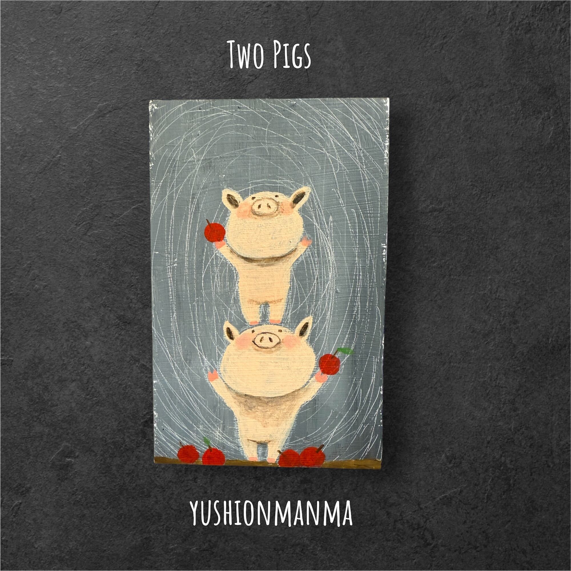 二匹の豚が描かれたアクリル画で、可愛らしいデザインが特徴です。