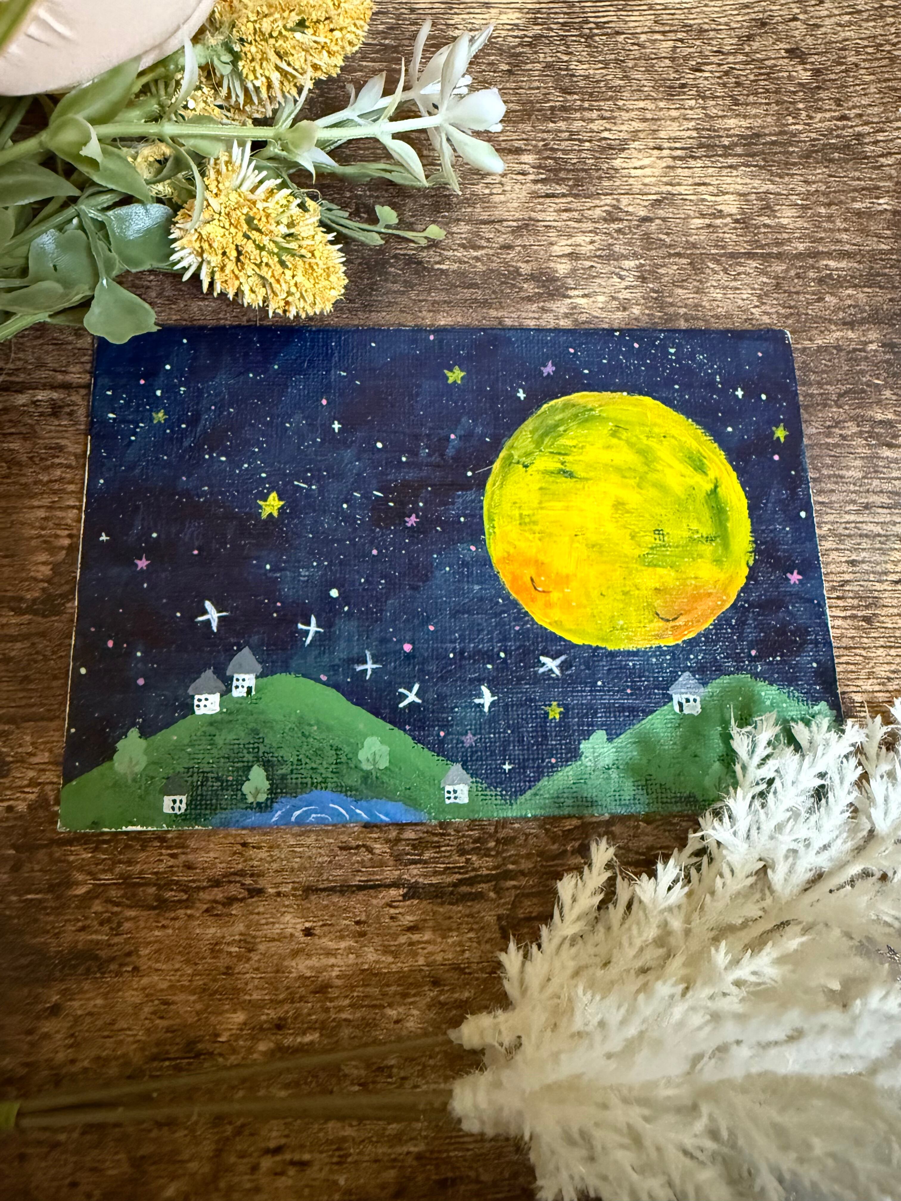 夜空と月をテーマにしたアクリル画。
