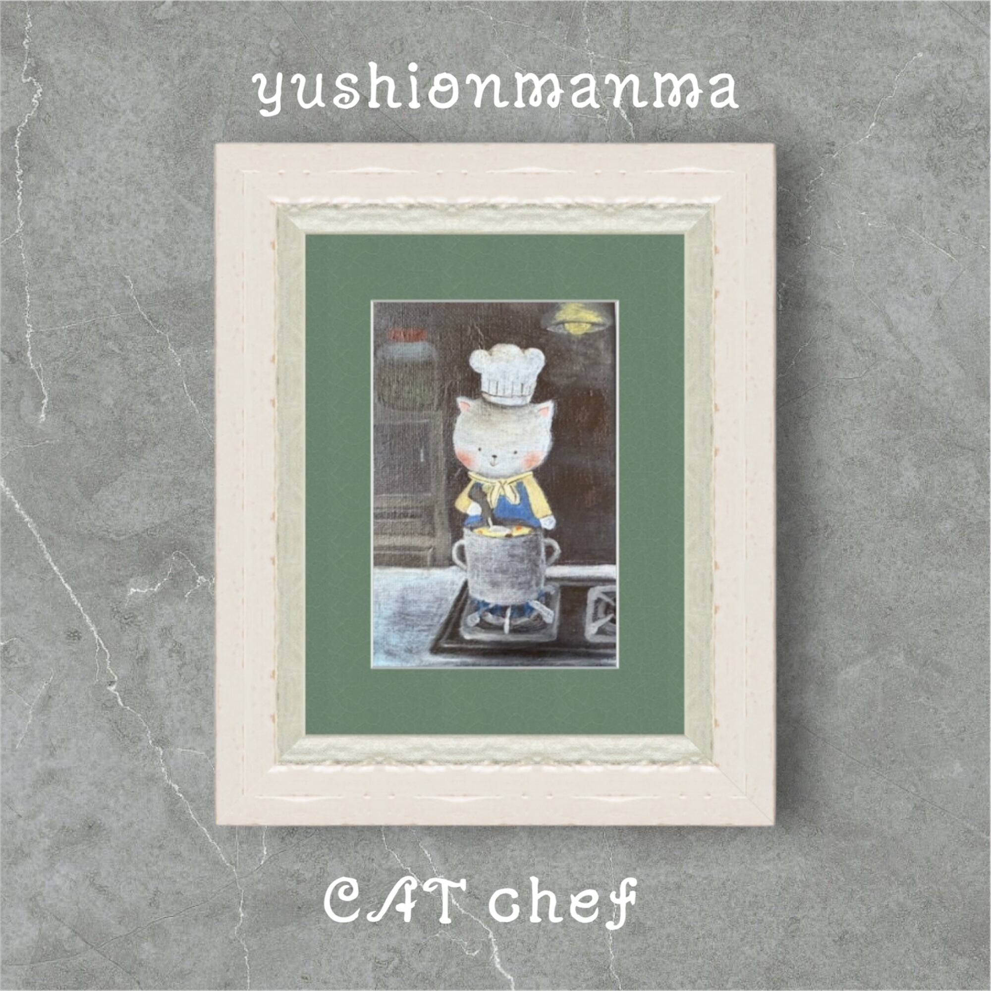 シェフの帽子をかぶった猫が料理している可愛らしいアクリル画です。