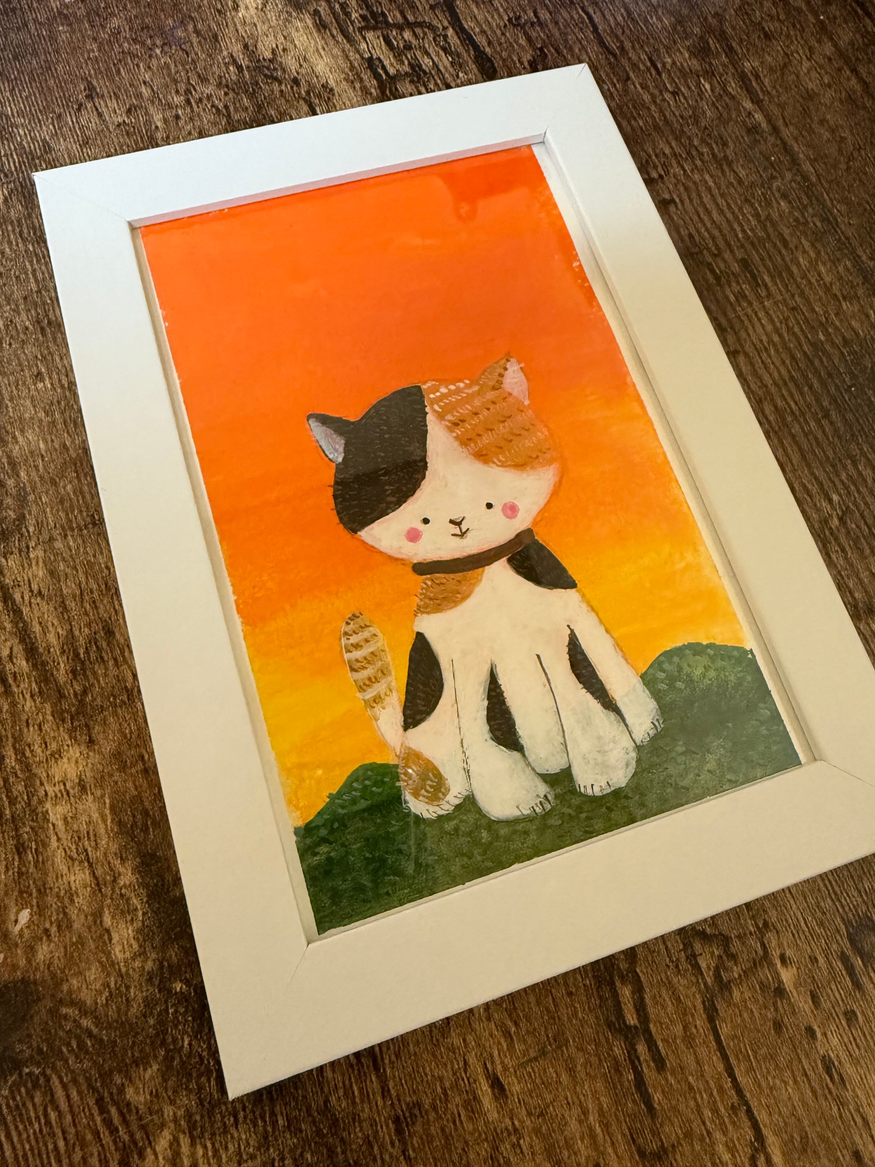描かれた可愛い三毛猫のアクリル画。