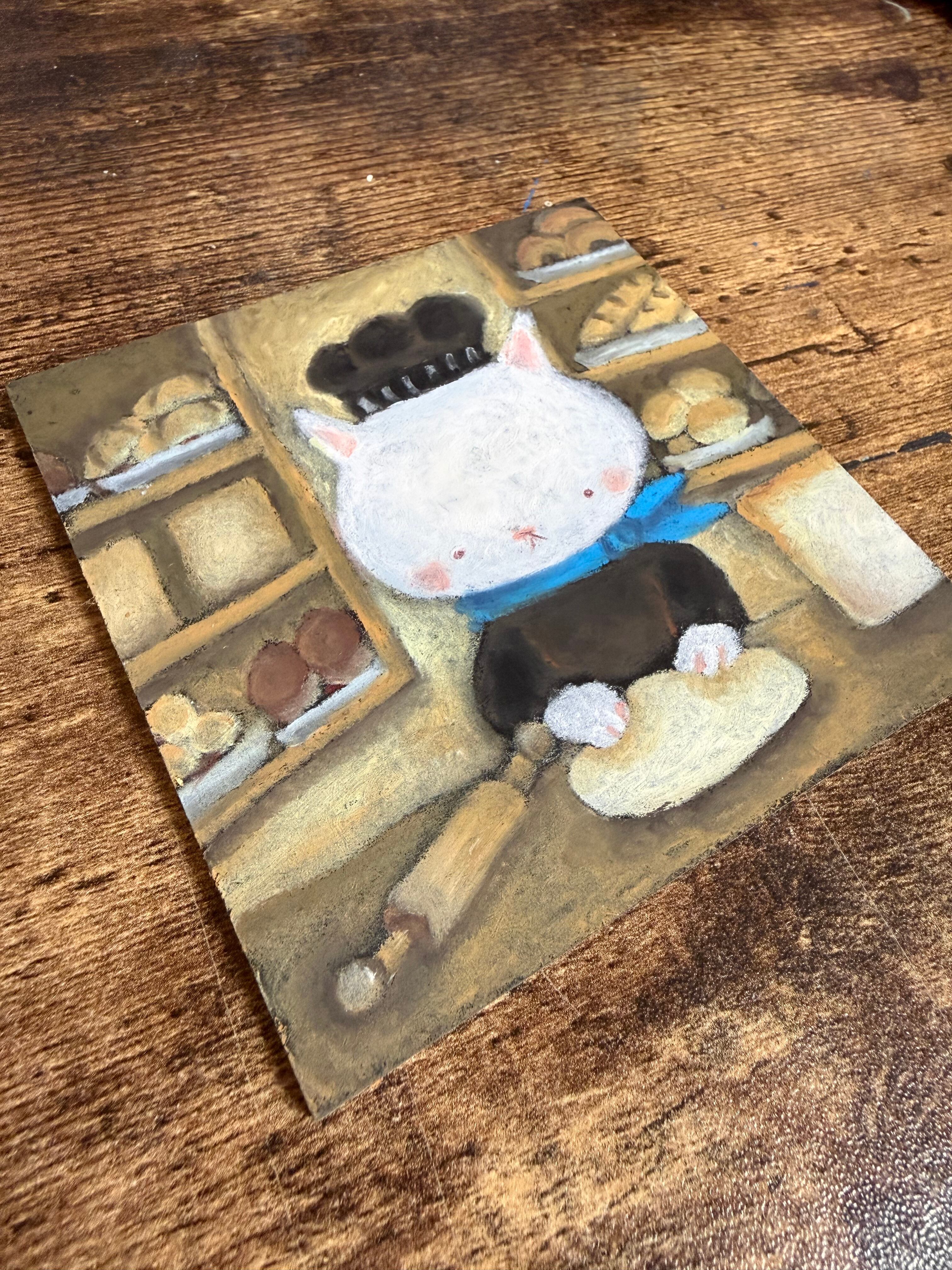 白猫のパン屋こねこね見習い☆オイルパステル画