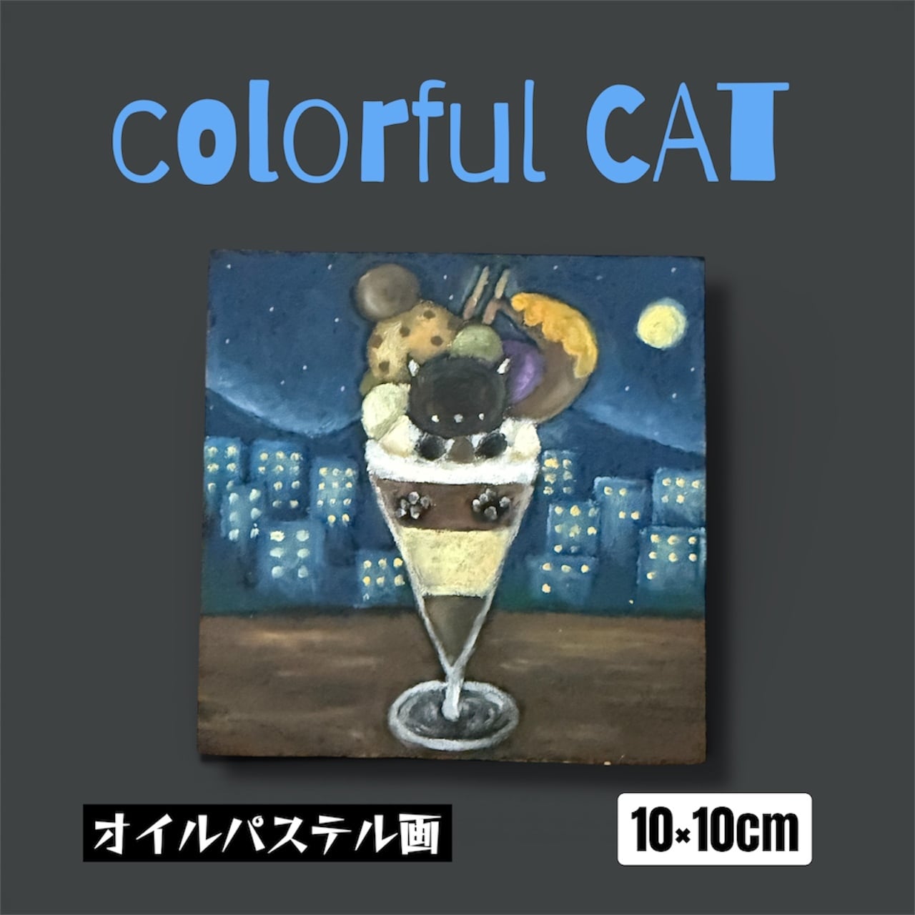 愛らしい黒猫がしめパフェに寄り添う姿を描いたオイルパステル画です。この作品は、見る人に癒しと心温まる瞬間を届けます✨