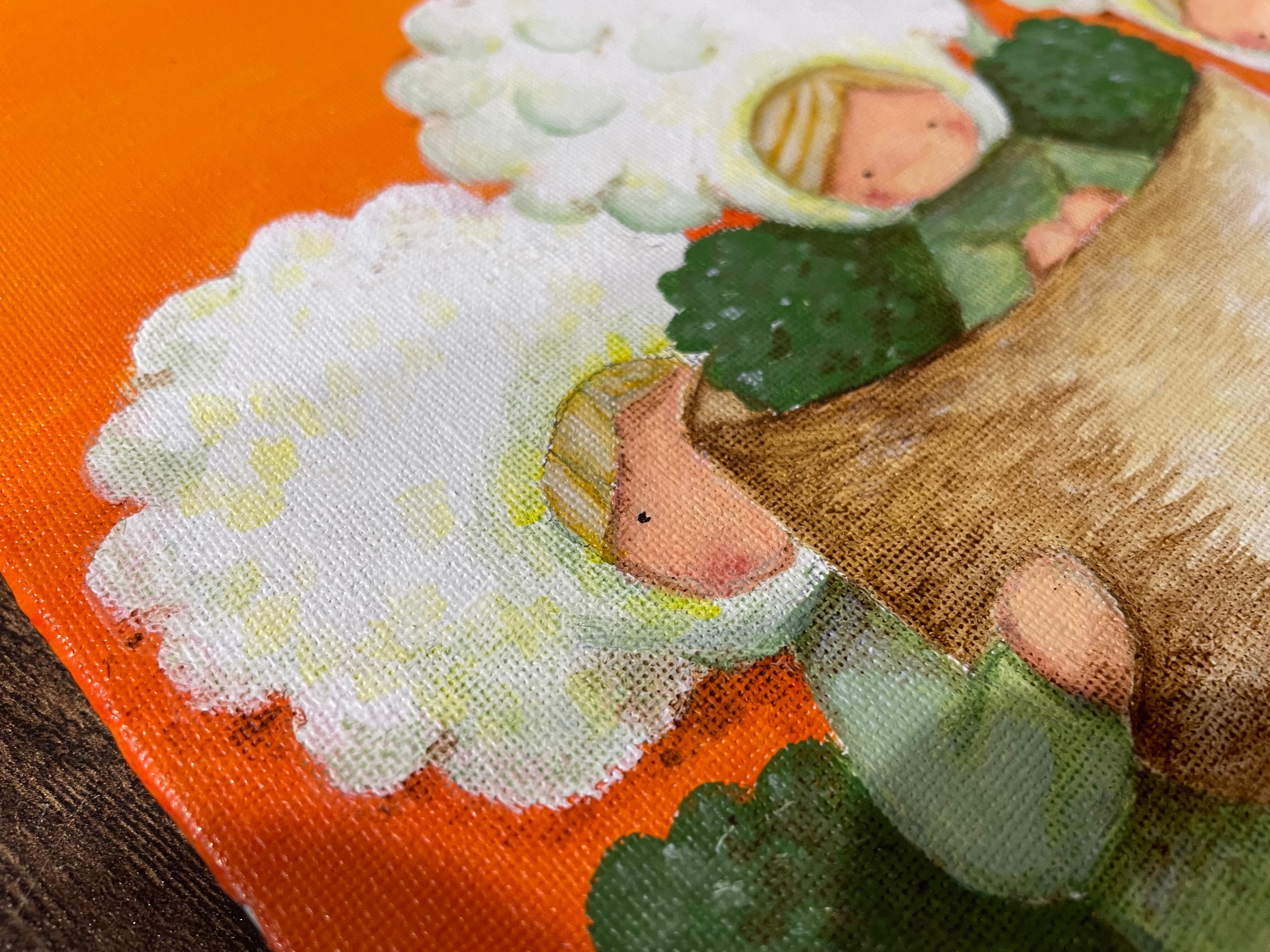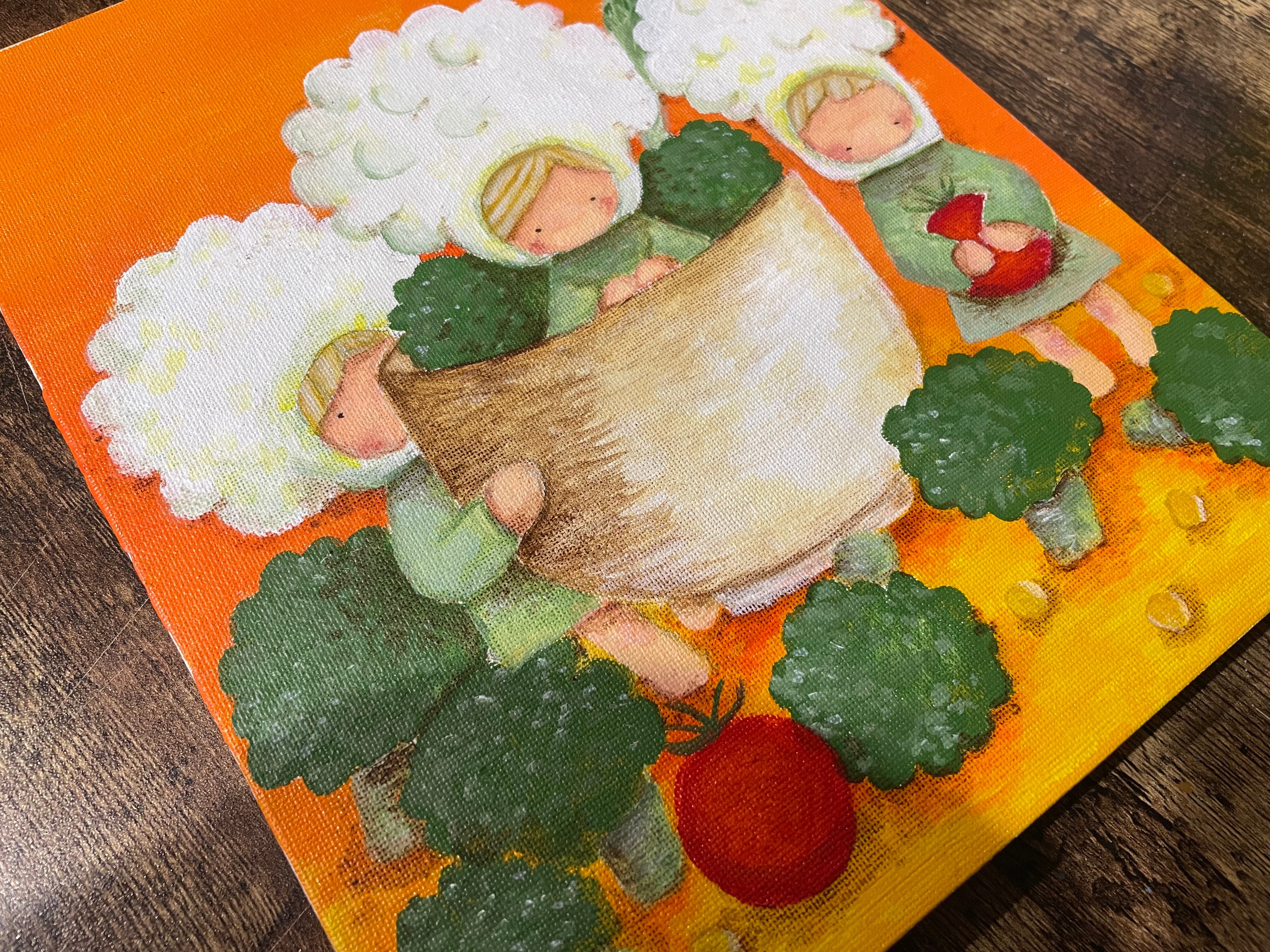 カリフラワー3姉妹の可愛らしいアクリル画です。